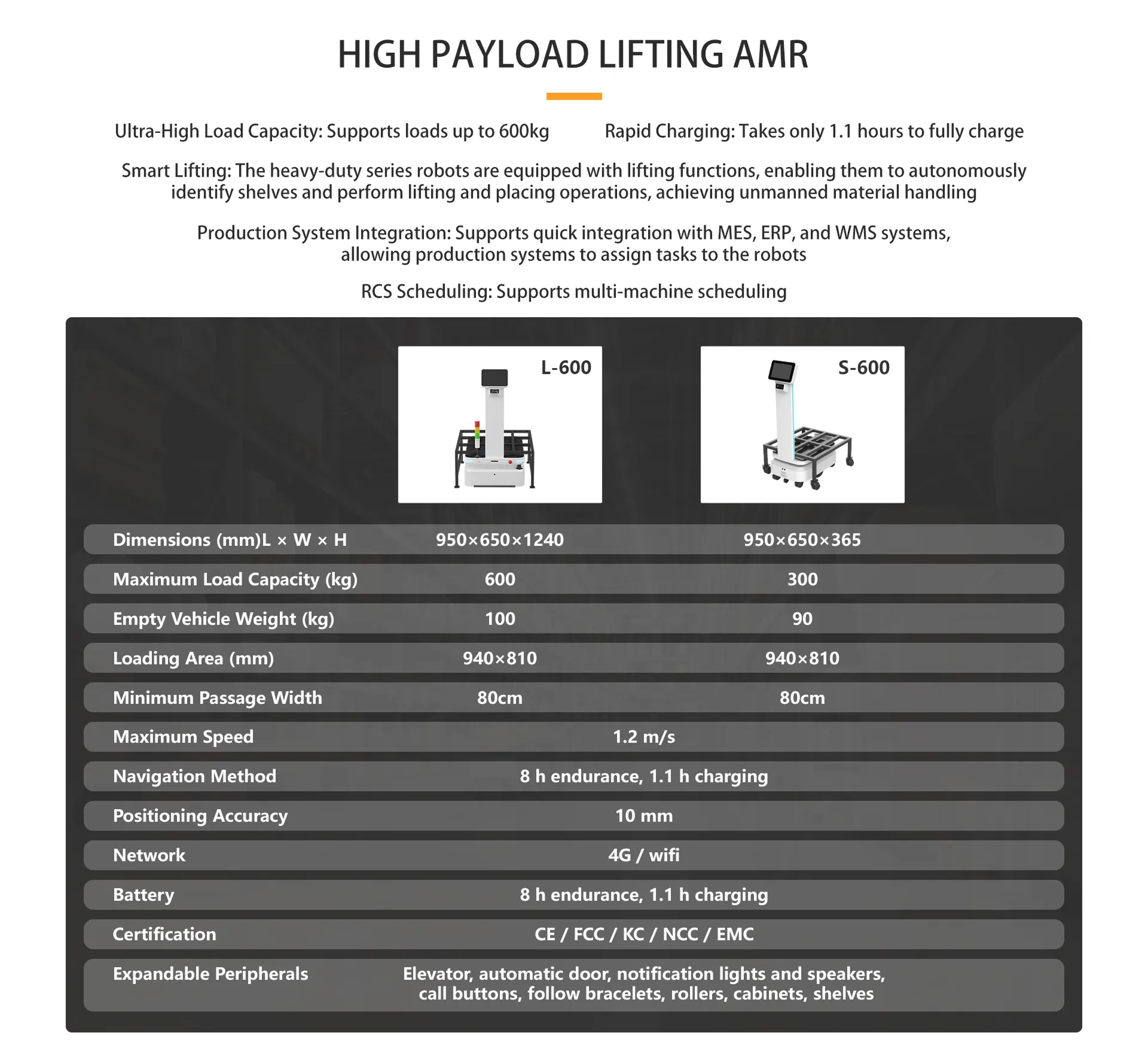 Thanks to its advanced lifting system, the Heavy Load AMR can identify shelves, transport goods, and place items with precision. This automation reduces manual effort, lowers operational risks, and boosts productivity. Moreover, with a rapid charging time of 1.1 hours and an 8-hour battery endurance, it supports continuous operations without delays.